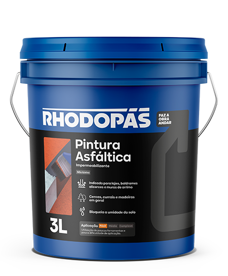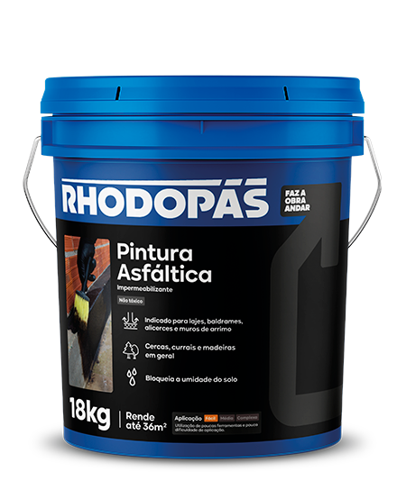 Rhodopás Pintura Asfáltica é utilizado para inibir totalmente a passagem de umidade, formando uma película impermeável e flexível; o produto é de secagem rápida. Rhodopás Pintura Asfáltica é indicado para aplicação em superfícies tais como: paredes, lajes, abóbadas, alicerces, mantas, telhas, lajotas, etc., podendo ser aplicado com pincel ou escovão. Não é indicada a sua aplicação sobre superfícies úmidas e deve ser protegido da incidência de chuvas até a sua plena secagem. Não deve ser usado em caixas d’água.
